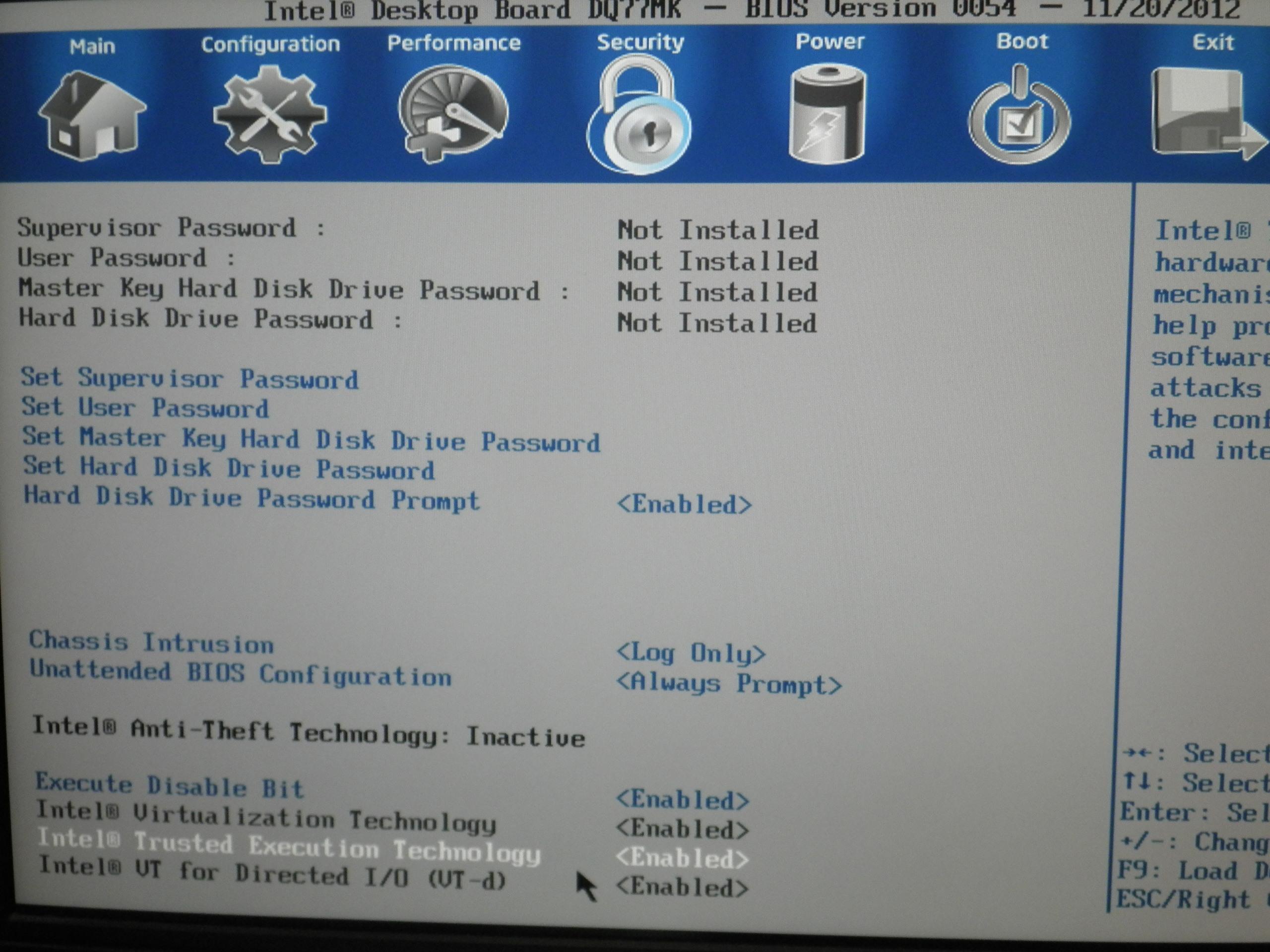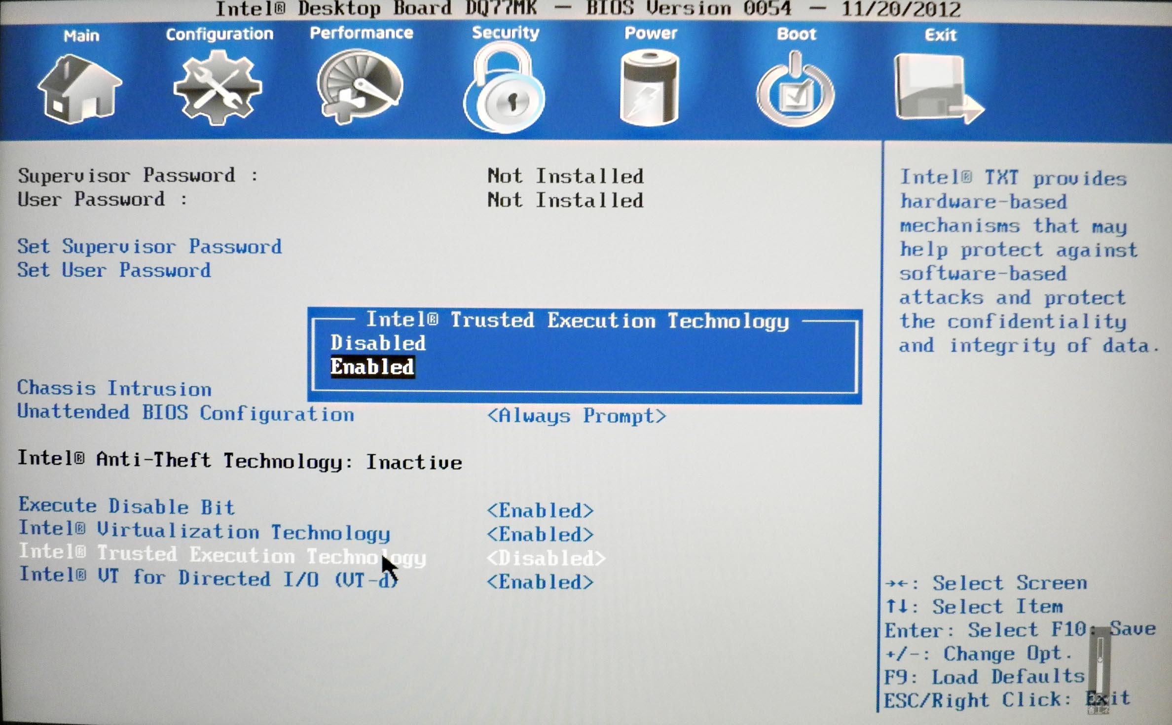 これは、インテルTXTがハードウエアー的にセキュリティチップ(TPM)を使用してハッシュ値を保存しており、ハッシュ関数を用いて以前のハッシュ値と現在のハッシュ値の差異を見る仕様になっているためで、ハードウエアー的にサポートできていなければ、動作が出来ないからである
