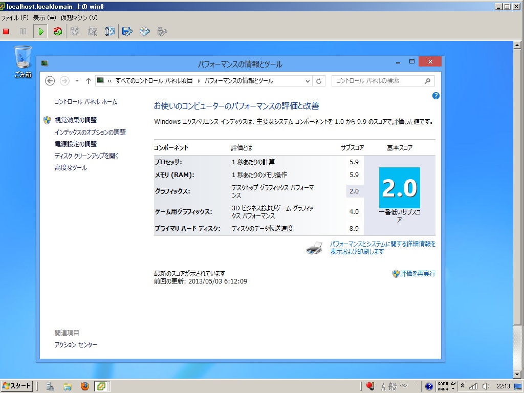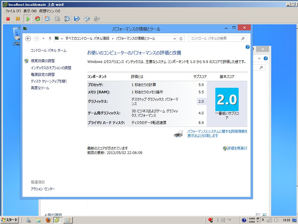 ハードディスクのスコアが高いのはSSDを装着しているからですが、仮想マシン上でも8.9と高評価です。多分ですがSSDに関してはほとんどオーバーヘッドはないでしょう。