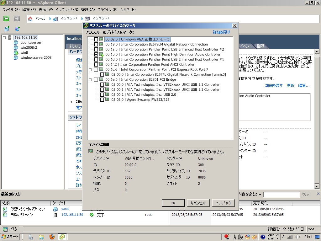 ○インターフェイスがPCIであっても内部的にUSB接続の物はPCIパススルーではなくUSBパススルーで認識できる