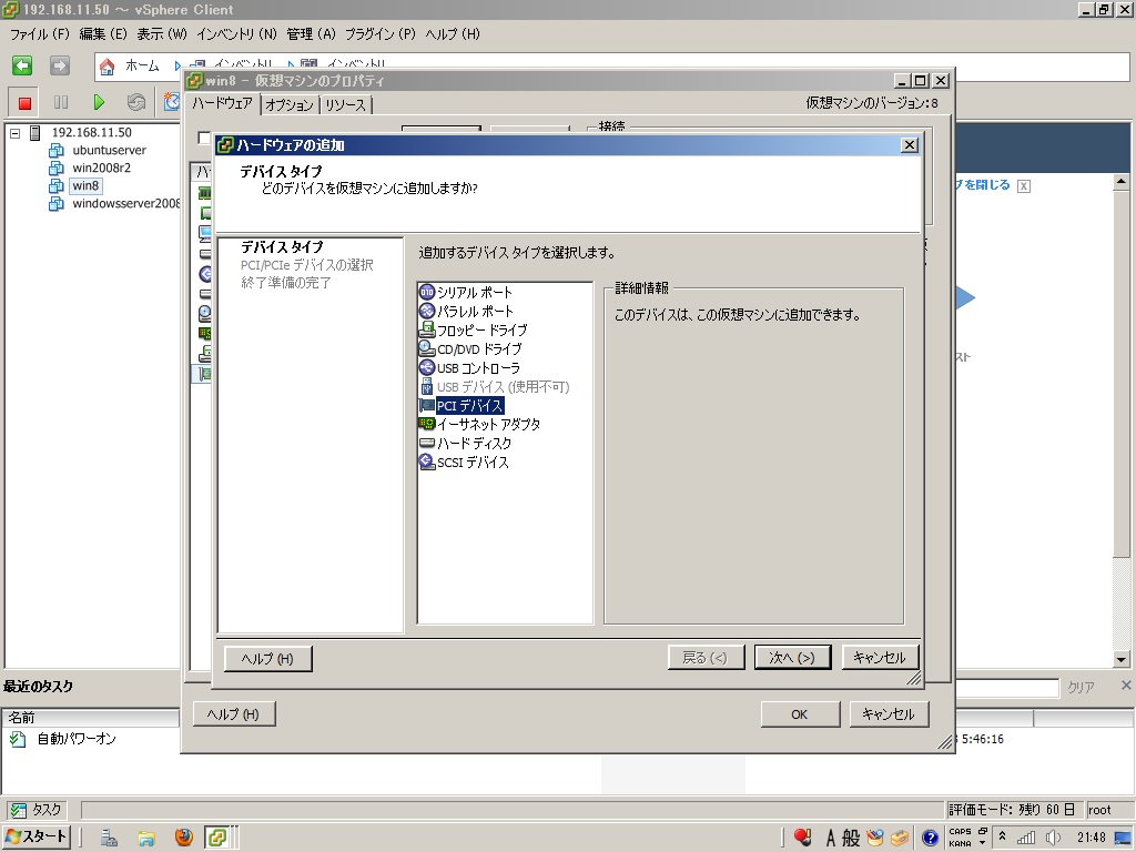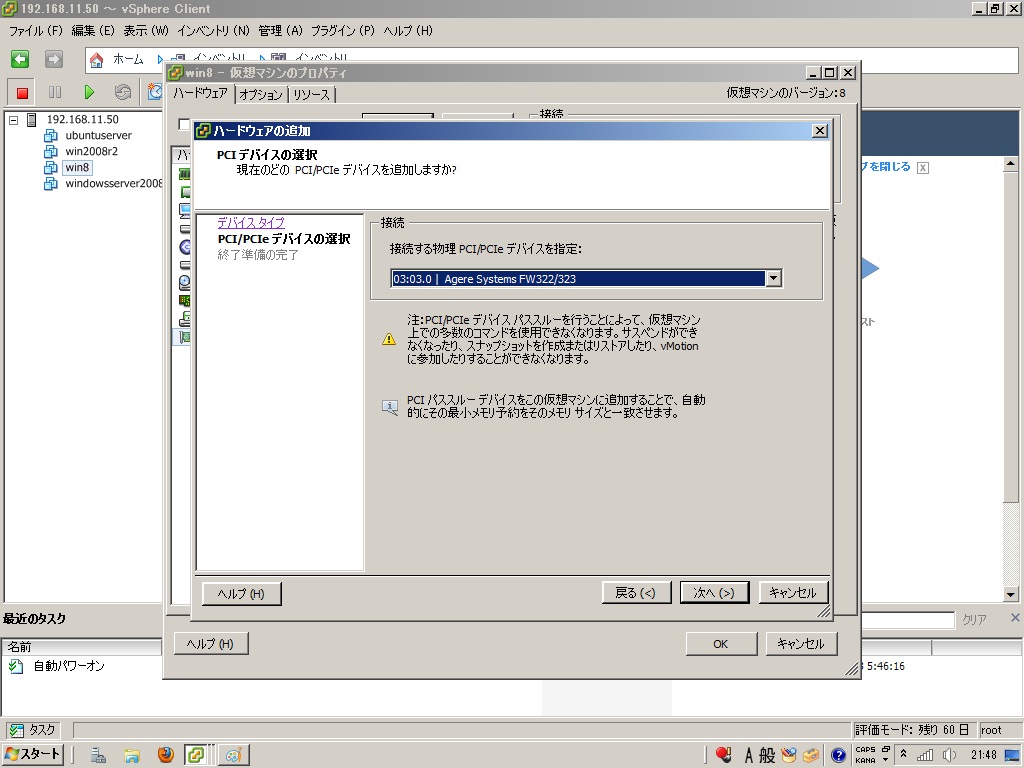 メモリーを3GBにして再度エクスペリエンスインデックスを行おうとしたところ、仮想マシンの設定画面でエラーが出てしまいました。この場合は一度パススルーしたデバイスを削除し、メモリーを増やしてから再度追加するとうまくいきます。またはESXi側が増やしたメモリー量に合わせて設定変更しますかと聞いてくる場合があります。エラーが出たのは設定変更をしかなったためだと思いますが詳しく覚えていないです。