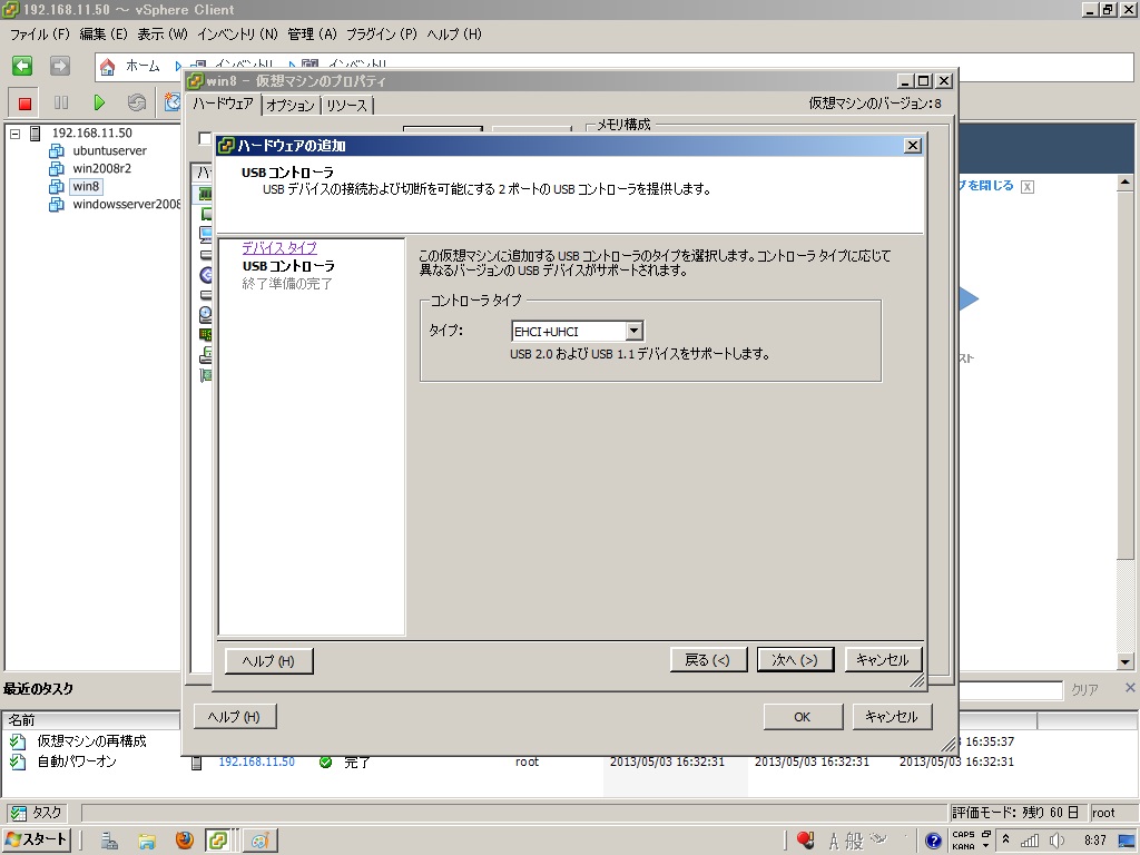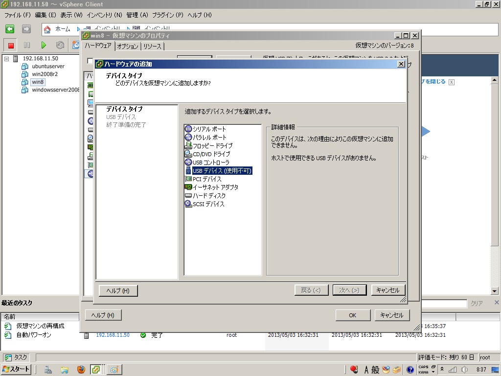 マザーボード上に元々あるUSB端子に接続されたUSBデバイスは仮想マシンの設定を編集することで仮想マシンに認識することができます。