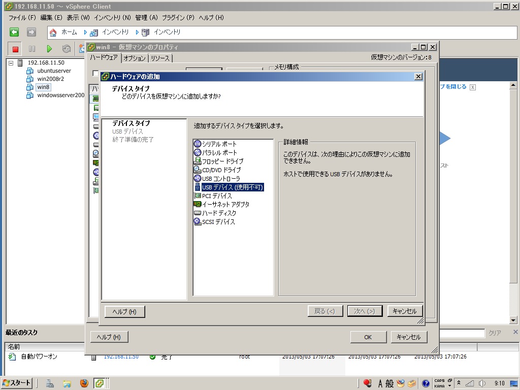 次にUSBデバイスを選択しようとしましたが使用不可となっており接続できませんでした。