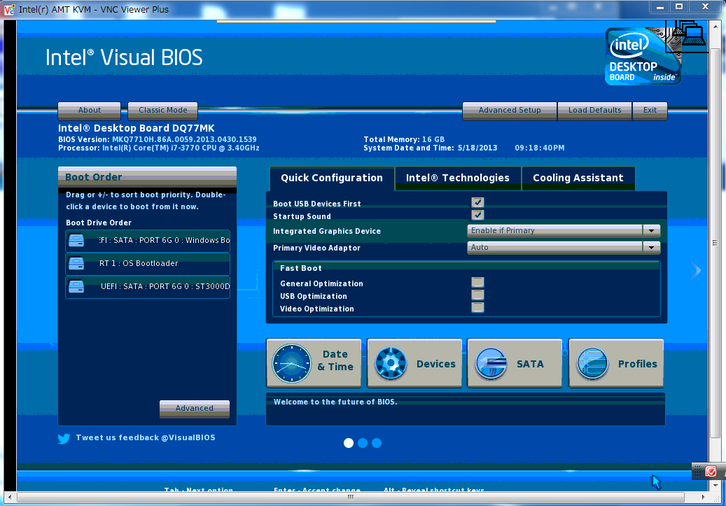 今回は、レビューの最初でアップデートしたのですが、4/30にVirtual BIOS対応版がIntelから配布されています。こちらはGUIでの設定となります。それより前のバージョンは従来のテキストベースのBIOSになります。