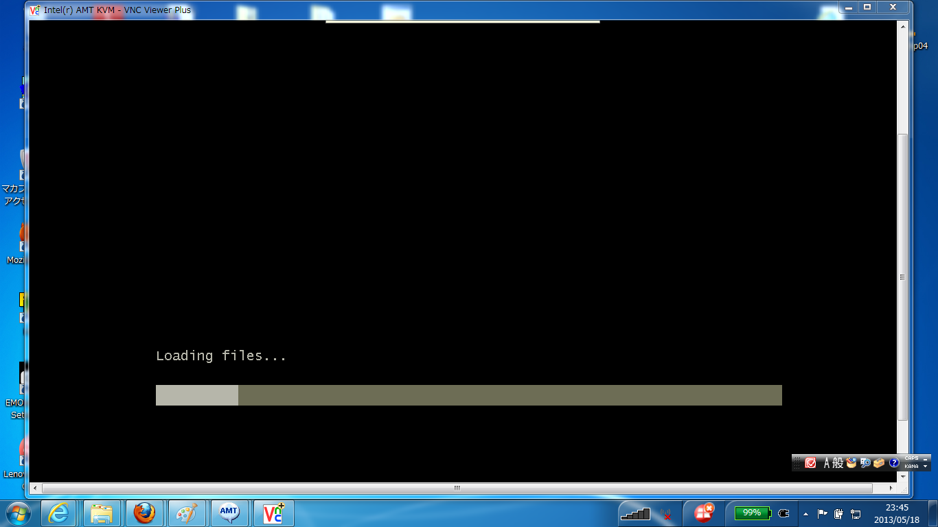 マウントしたら、Disk Redirect のRedirection StartをOn Next Resetにしてから、Remote ControlのReboot to Redirect CDとかを選選ぶと起動します。つまり、手元の起動ディスクのイメージファイルから起動できます。今回はRealVNCに付属のイメージを使ったので、こんな画像になりました。
