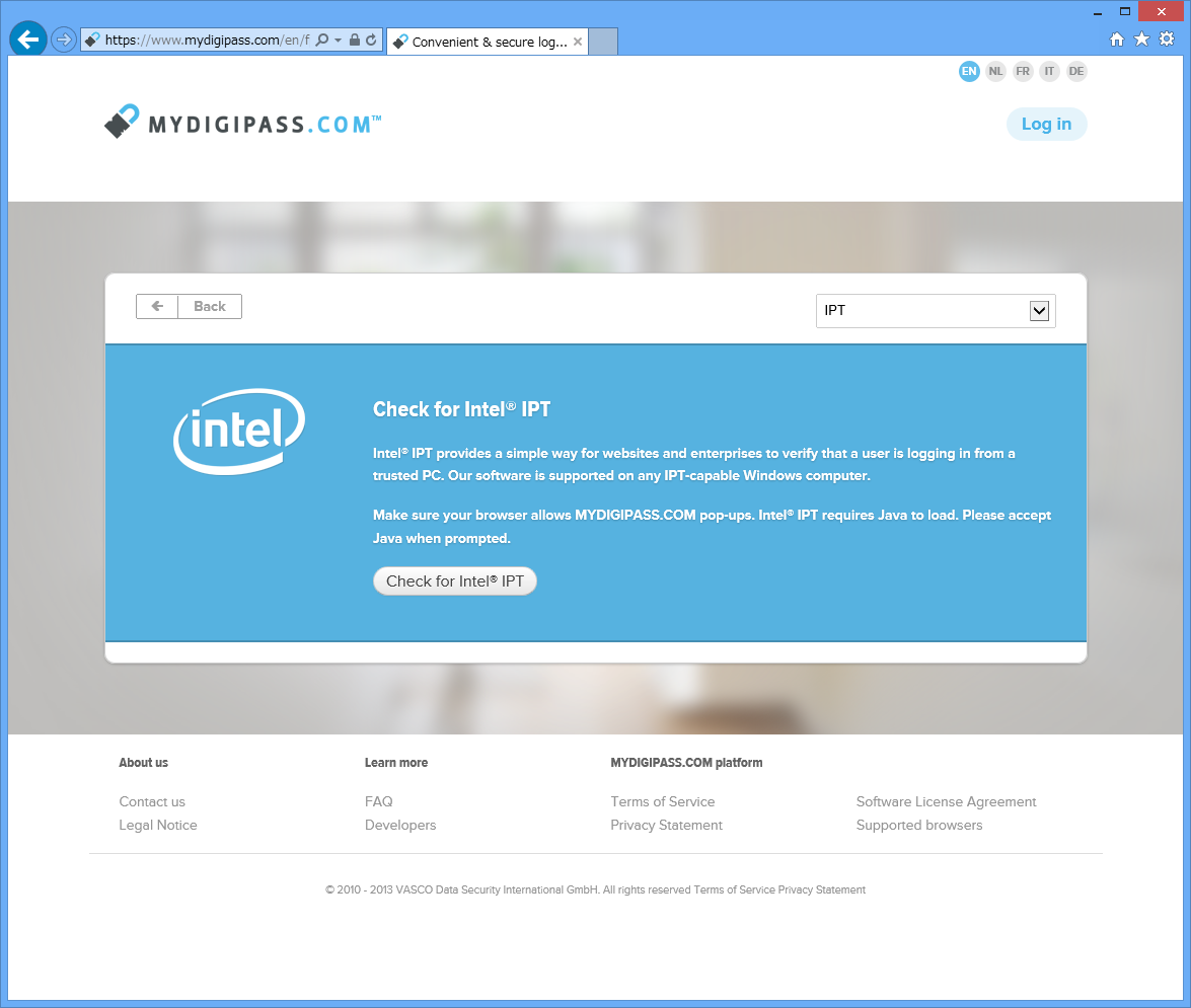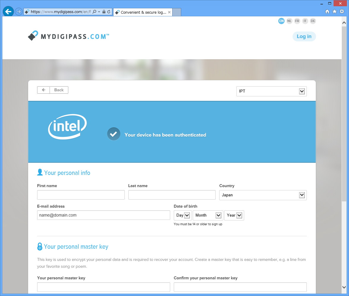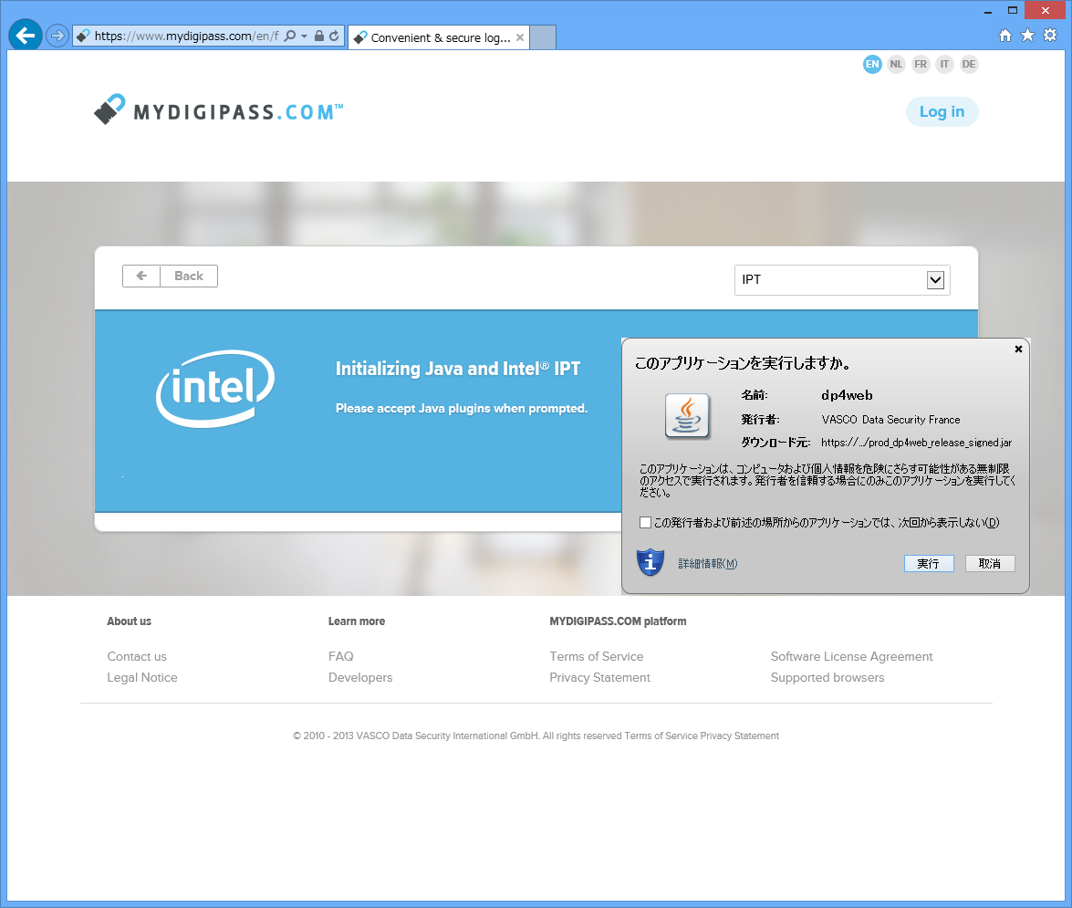 IPTが搭載されているデバイスの場合(上の画面でIPT対応PCを選択した時も同様)は、IPTのチェック用のJavaが起動し、IPTをサポートしている場合にはメールアドレスとトークンの代わりにマスターパスワードを入力することになります。