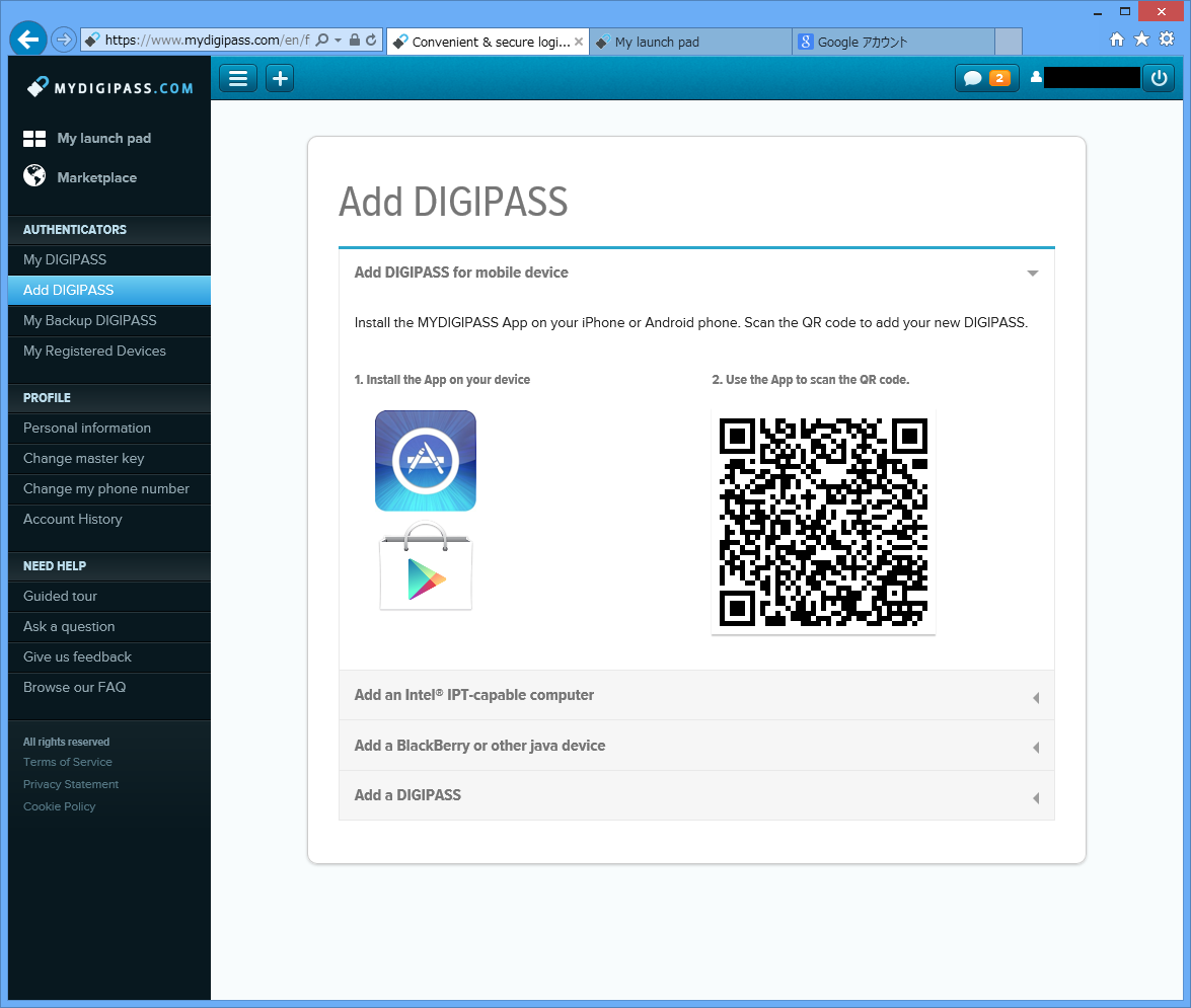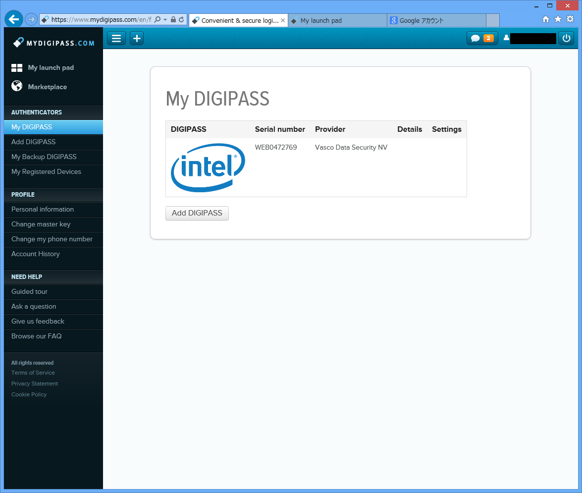 My DIGIPASS画面でデバイスが登録されているのが確認できます。