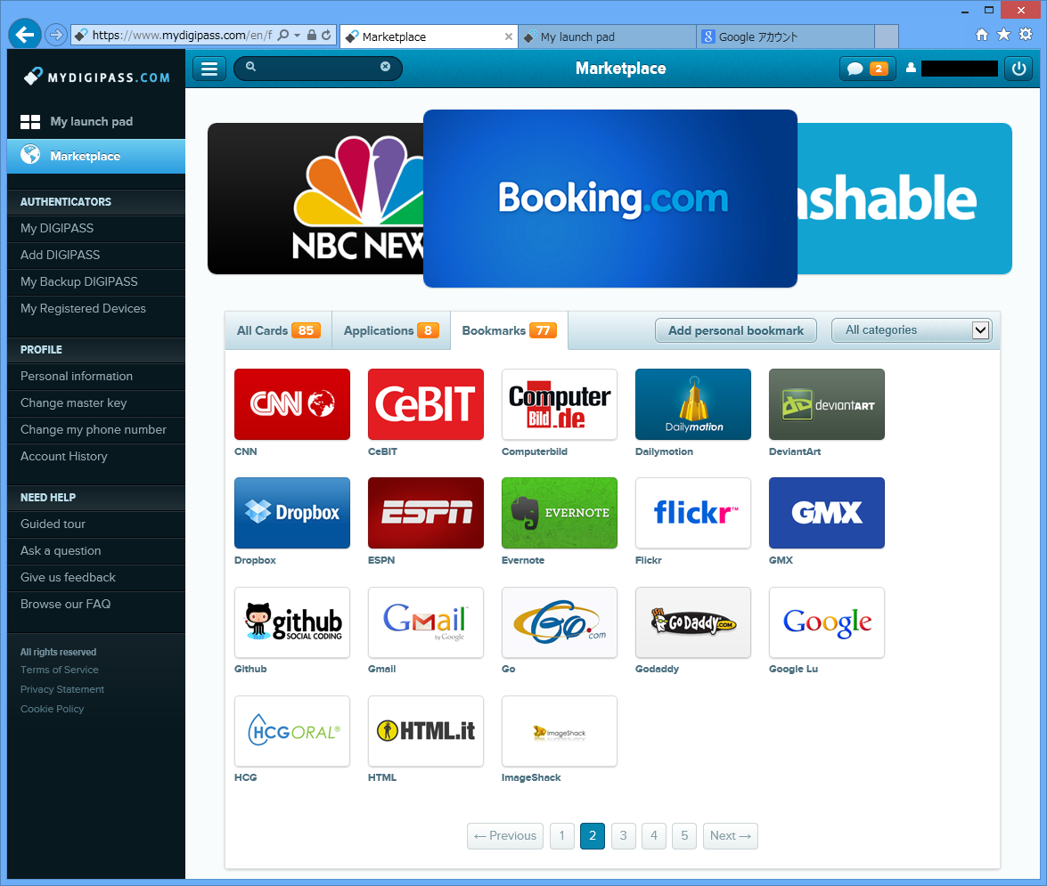 ここで、先ほどのブックマークはログイン情報を持ってくれているだけですが、Applicationと呼ばれるMYDIGIPASS対応サイトがあります。もっとも、8種類のほとんどがMYDIGIPASSのメーカー関連なのですが・・・・。