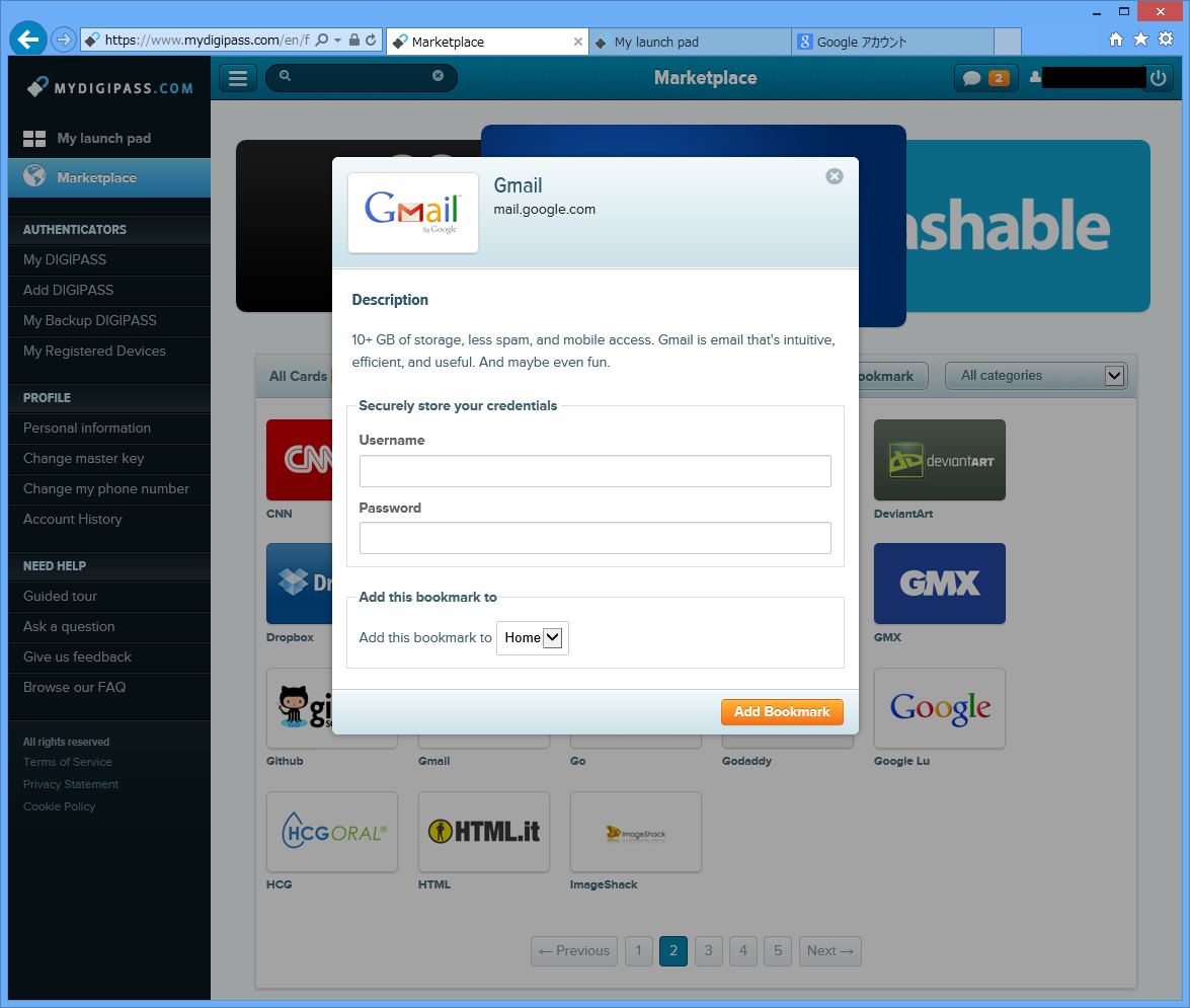 ブックマークしたいサイトを選んでアカウント情報を入力します。