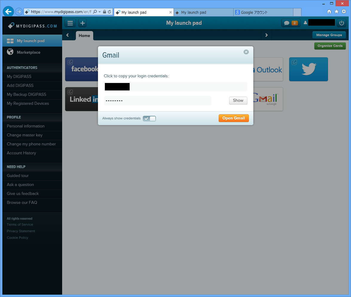 設定したサイトをLaunchPad画面からクリックすると、保存していたアカウント情報が表示されます。表示をクリックすると、クリップボードにコピーされます。けっして、自動で入力はしてくれません。