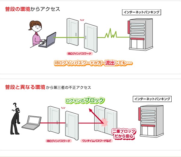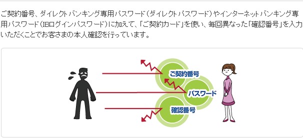 以前は、契約番号、ダイレクトバンキング専用パスワード(ダイレクトパスワード)やインターネットバンキング専用パスワード(IBログインパスワード)に加えて、「契約カード」を使い、毎回異なった「確認番号」を入力することで、本人確認を行っていましたが、最近では登録した、Eメールアドレスに通知される、使い捨てのパスワード(6桁の数字)の入力が求められるようになっています。