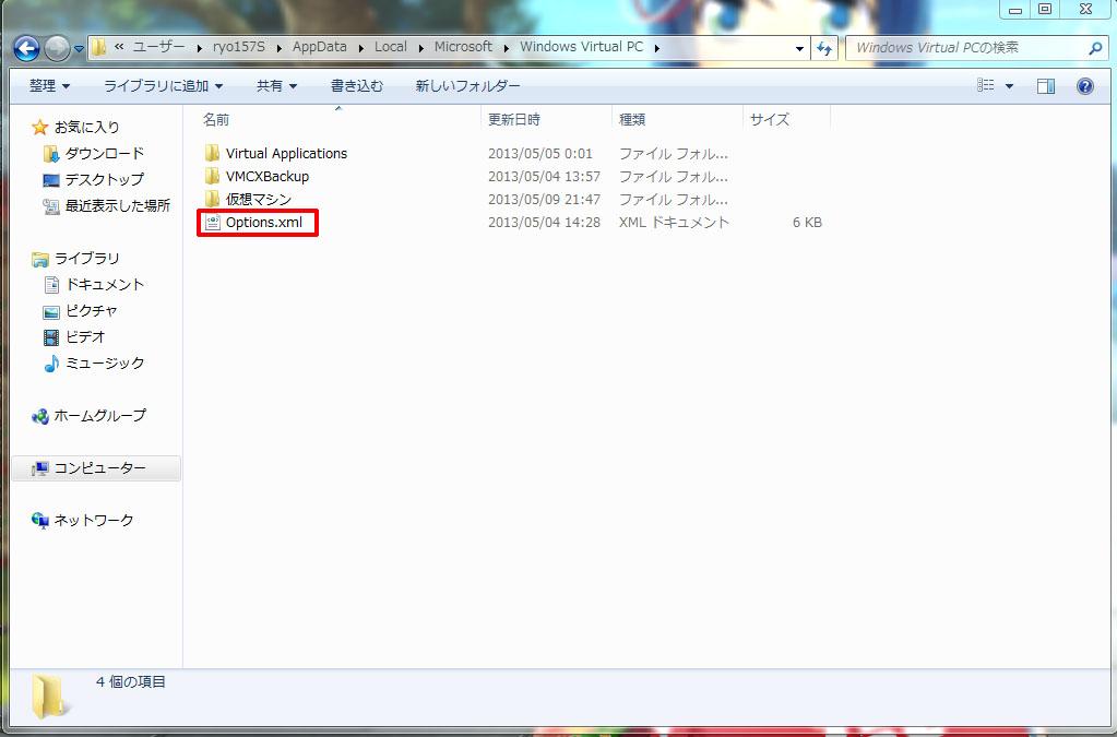 ユーザーファイル内にあった関係ありそうなOption.xmlをメモ帳で改ざん。