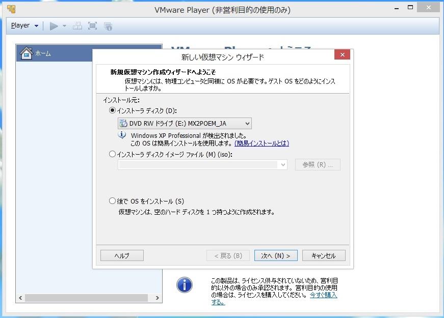 ただ、こちらのVMWare Playerの場合、インストール時に、Windows XP MCEの2枚目のCDが要求されず、Windows XP Proと認識されているようです。