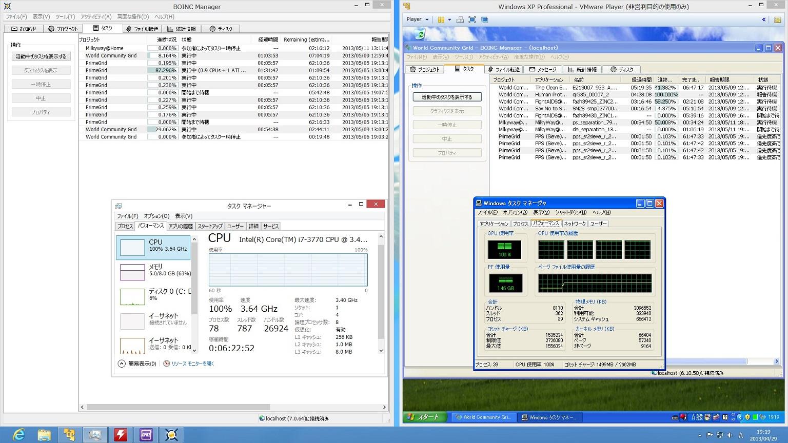 特に、Windows XPが必要なソフトウェアは使用していないので、とりあえずBOINCをWindows8と仮想PCのWindowsXPの両方で実行してみました。